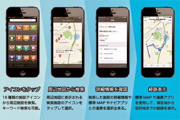 検索した施設は、3つの連携アプリ(標準マップ、NaviCon [株式会社デンソー]、NAVIelite [AISIN AW co.,ltd.] )に表示させることができ、連携アプリ側で現在地から検索した施設までの経路を確認することができます。